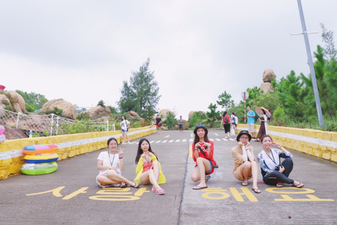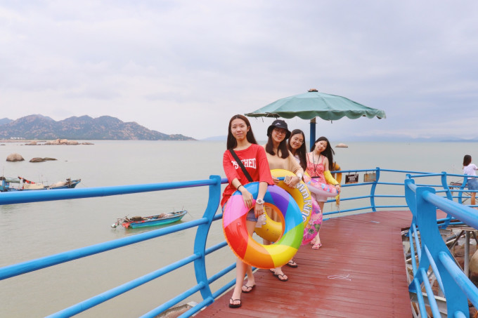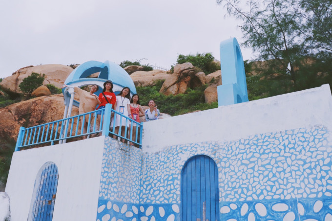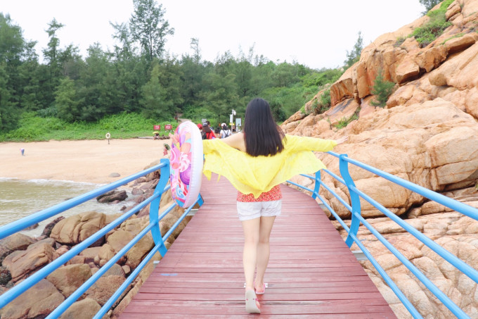 提了一路。。。。大家可千万别干这种傻事。去到再打气也可以的。我们就沿着栈道走到拍摄的摄影基地,沿途经过了4个还是5个小沙滩,只有一进园区的那个沙滩可以下去玩,其他都不行。不过沙滩上真的有很多小螃蟹可以抓。还有一些石头的缝隙处是可以钻进去走的。然而我们的游泳圈。。。啊,,西八………………