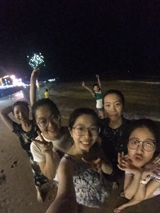 吃完饭后,我们就回酒店拿提前买好的烟花,虽然知道那边会有烟花卖,但我们还是自带了。然后就回到胜海附近,这大概100米处就有一个免费的沙滩,沙滩边上有很多酒店,酒店下面会有很多烧烤炉之类的,有很多旅客在这里吃住。我们往楼梯下面走,就走到了沙滩,当时8点多,已经有很多人在那边放烟花了。我们掏出自己买的烟花~比起人家的轰轰轰,真的羞。不过也玩到了10点多回去洗澡。