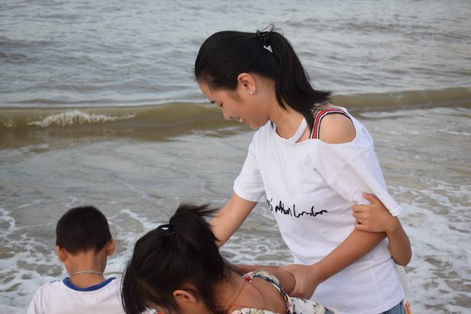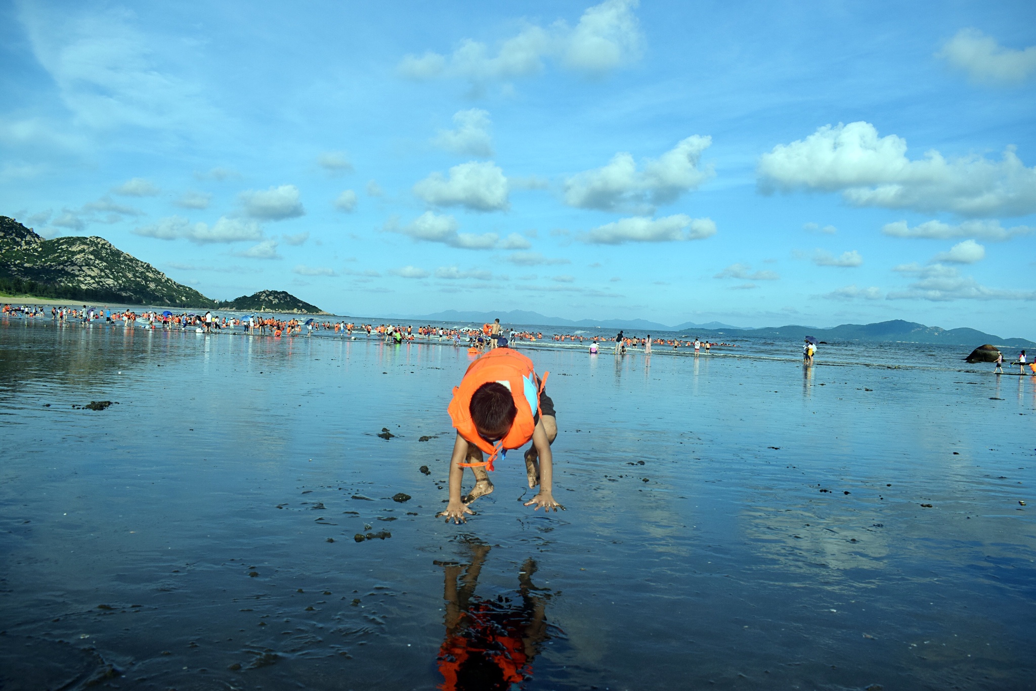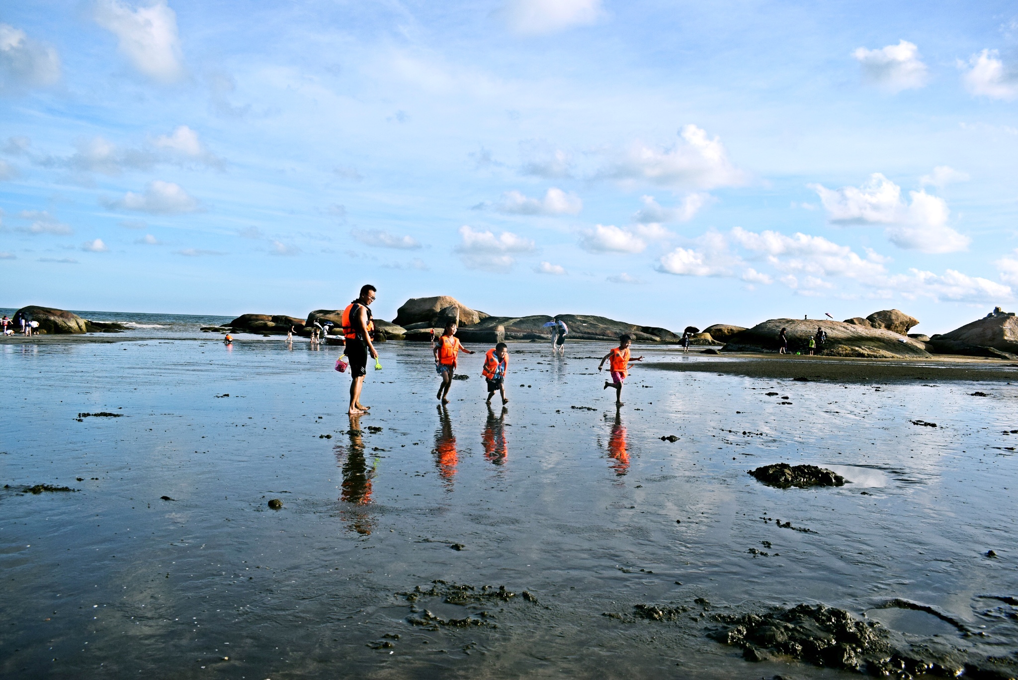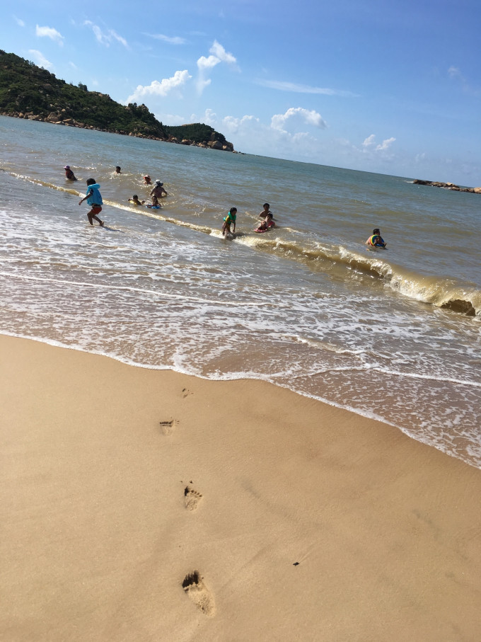 16:00进入景区,首先在沙滩上领取救生衣(规定穿救生衣才能下海);穿上以后直接奔向大海,三个小朋友第一次看见大海,疯一般的撒欢。